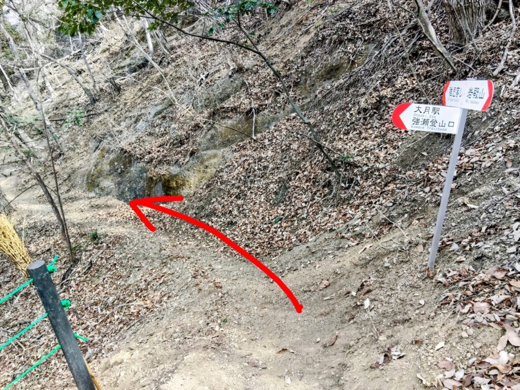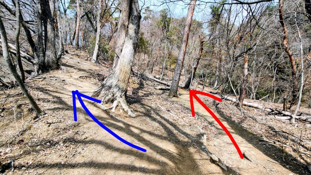 岩場コースを過ぎると、一瞬迷ってしまう二股が。